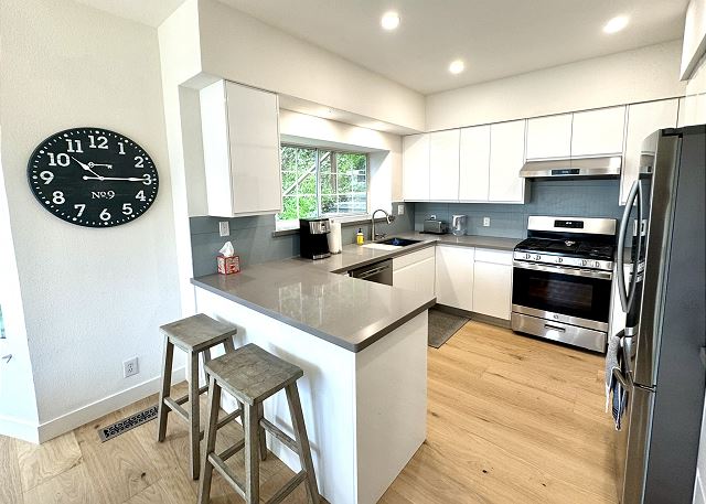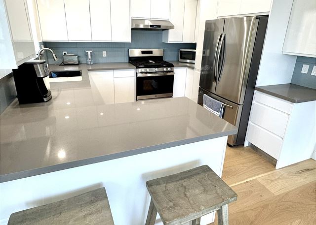 The fully equipped kitchen features:, Sleek quartz countertops, Stainless steel appliances, Gas range, Breakfast bar seating