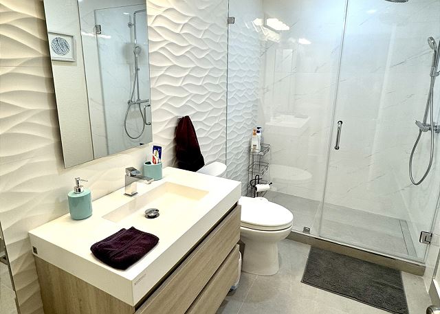 Beautifully remodeled bathrooms with a walk-in glass shower with modern finishes and spa-like feel