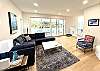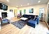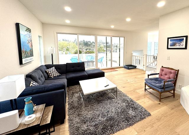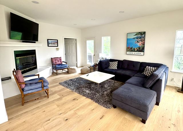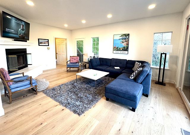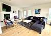 Step into a bright and airy open-concept living area featuring: Comfortable sectional seating for gathering and relaxing, Cozy fireplace for cool coastal evenings, Large windows and sliding doors that bring in natural light, Direct access to a sunny deck with ocean views